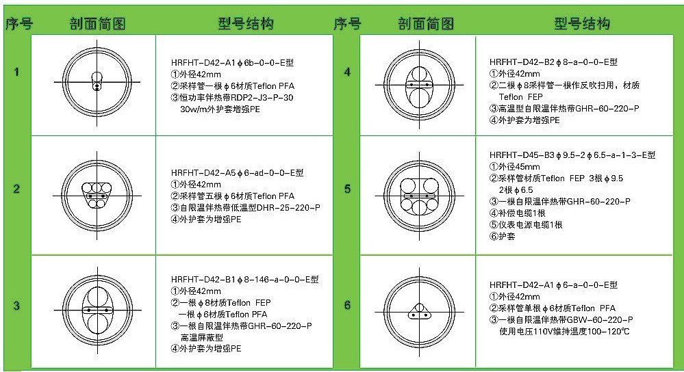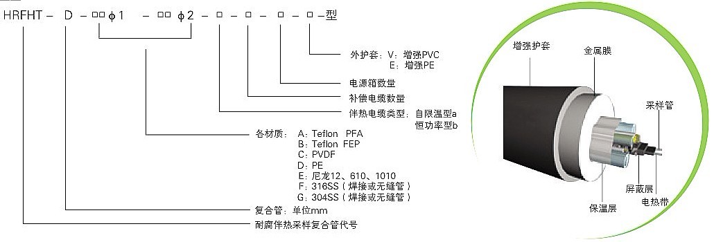 耐腐采樣伴熱復合管是環(huán)保監(jiān)測系統(tǒng)中的重要部件,它是由一組耐腐高性能樹脂導管輔以自限溫伴熱帶以及補償線纜組成內芯,外加保溫層,最后敷以阻燃聚乙烯(PE)保護外套復合而成。自限溫伴熱帶的自動限溫功能,可以保證采樣管內維持一定的溫度,從而盡可能保證采集樣品與初始值保持一致,最終確保環(huán)保監(jiān)測系統(tǒng)連續(xù)、正確地采集樣氣。根據(jù)采集樣氣的成份、溫度等實際情況,耐腐伴熱采樣復合管中采樣導管可以選用不同的材質,如PFA(四氟乙烯與全氟烷基醚共聚物)、FEP(四氟乙烯和六氟丙烯共聚物)、PVDF(聚偏二氟乙烯)、PE(阻燃聚乙烯)、尼龍610等等, 伴熱帶可以選用中、低、高溫度伴熱帶,另外還可以根據(jù)用戶要求添加補償導線、電源線等 。