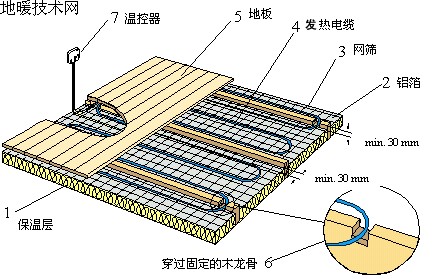 在建筑物地面結構層上,首先鋪設高效保溫材料及聚脂真空鍍鋁膜,起到單向保溫和隔熱的作用,在保溫材料上鋪設焊接鋼絲網,然后將發熱電纜按設計要求的間距固定在鋼絲網上,再填充豆石混凝土,經搗實養護達到強度后,再做地面面層,面層采用花崗巖、瓷磚等,但必須遵守《發熱電纜地板采暖系統用戶使用手冊》,以免破壞采暖系統。地板構造如下圖所示: