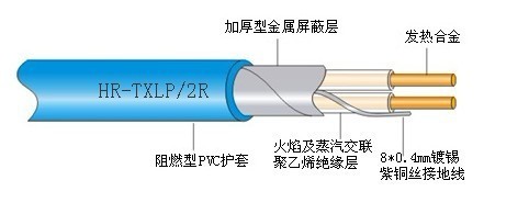 它結(jié)構(gòu)包括有:護(hù)套:藍(lán)色聚氯乙烯( PVC );   接地線:鍍錫銅絲;   屏蔽層:鋁箔 + 銅絲; 內(nèi)導(dǎo)體:合金電阻絲+銅絲; 內(nèi)絕緣:交聯(lián)聚乙烯( XLPE );