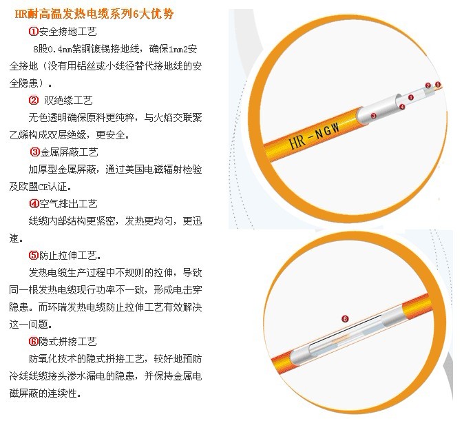 特點:是在傳統發熱電纜結構上增加了無色透明特氟隆絕緣層,與火焰及蒸汽交聯聚乙烯絕緣層構成雙層絕緣,更安全。解決了因外界溫度過高導致線纜擊穿的問題;解決了有傳統發熱電纜鋪設的地面上不能有覆蓋物的問題。