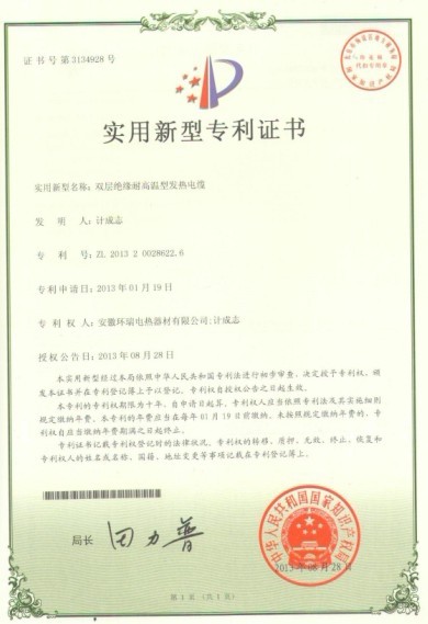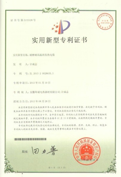 環(huán)瑞自成立研發(fā)小組至科學技術中心期間,通過獨立開發(fā),引進國外先進的生產工藝與技術,與合肥工業(yè)大學建立長期合作關系,聘請相關專業(yè)的技術專家等模式,投入大量的人力物力。我司以安全,實用性能為目標,通過改變發(fā)熱電纜結構與原材料,已研發(fā)成功。目前已獲得了關于畜牧養(yǎng)殖專用的國家專利證書,研發(fā)出耐高溫,耐磨的雙層絕緣的發(fā)熱電纜獲得了2項國家專利證書。包括之間我司獲得的“混凝土養(yǎng)護發(fā)熱電纜”“天溝融雪專用發(fā)熱電纜”,截止,我司已獲得了5項關于發(fā)熱電纜的國家專利證書,我司發(fā)熱電纜的生產技術已達到國內先進。共計19項專利。新的專利證書已下達。
