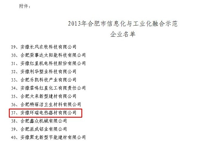 為加快推進我市兩化深度融合,發揮典型示范作用,依據《合肥市信息化與工業化融合示范企業認定管理辦法(試行)》和《合肥市第三方企業信息化公共服務平臺認定辦法(試行)》等文件,經企業申報、縣區推薦、專家評審和綜合審查,現確定安徽環瑞電熱器材有限公司,等40家為2013年合肥市 安徽環瑞將積極響應政府的有關倡導:不斷提升自身信息化應用水平,切實發揮示范企業帶動作用,認真總結信息化建設經驗,積極探索利用信息技術推動產業升級轉型,發展新型業務模式,培育新業態,走出一條合肥特色的信息化與工業化深度融合的“科技環瑞”的發展道路,促進電伴熱帶,發熱電纜產業結構優化升級,最終為振奮合肥的經濟,做出貢獻!