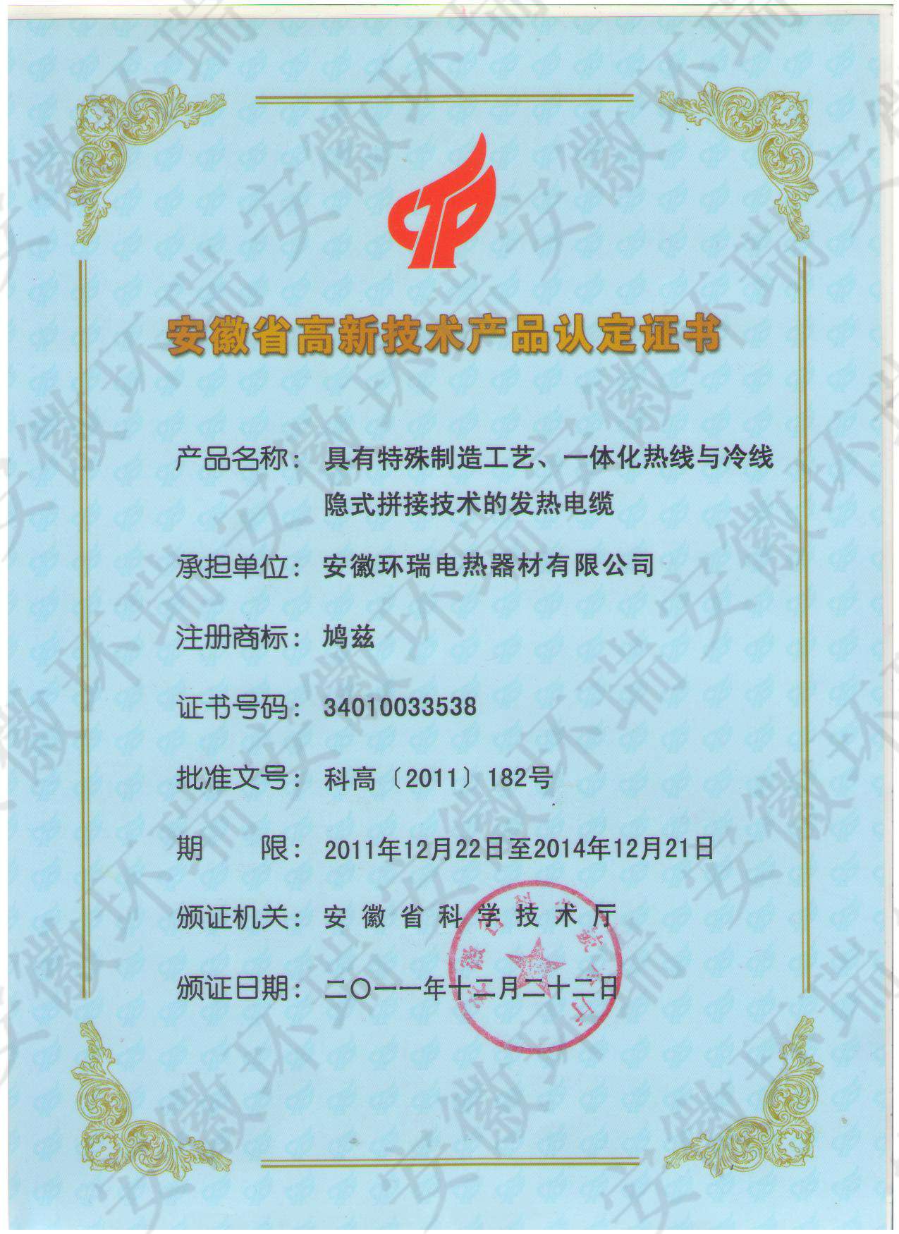 【喜訊】熱烈慶祝安徽環瑞獲得省科學廳發熱電纜高新技術產品